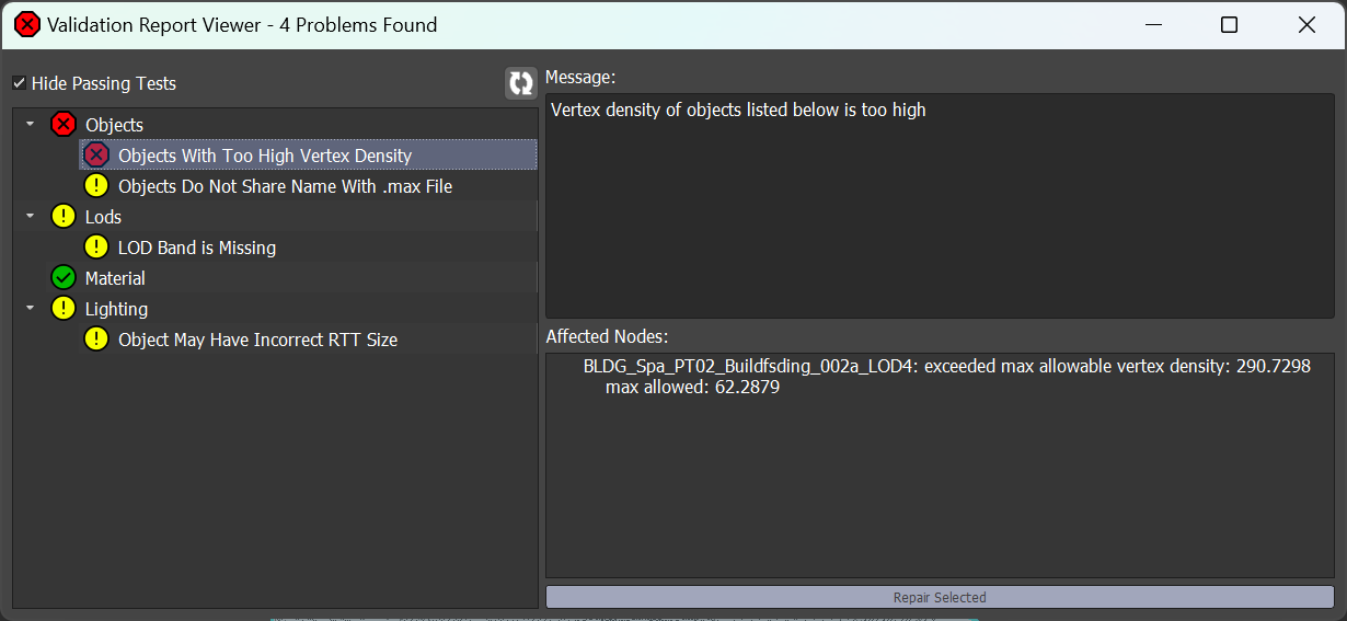 While checking for missing LOD Bands or mismatched object: file names was easy, the more numbers oriented content validation tests were much more complicated. In particular the vertex density test required a significant amount of data gathering and analysis as we had not determined any best practices or guidelines about mesh density.