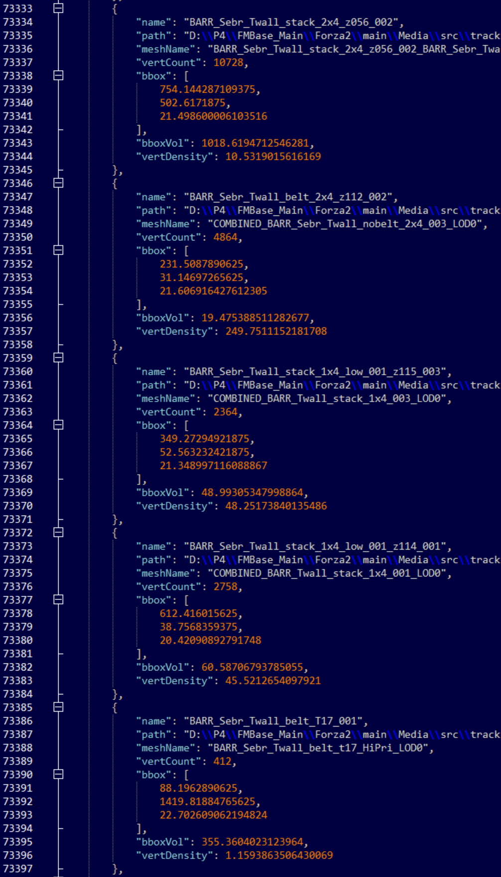 To write a simple, one size fits all, rule for vertex density I first needed to gather data to work from. I wrote a script that would write relevant data such as vertex count and object bounding box volume to a json database to work from. I ran this script and it took about a day to gather the data from thousands of individual 3ds max files per track. With this sizable dataset I started testing methods for calculating acceptable thresholds based on different parameters. The first approach of setting a threshold by object category (eg: barrier, building, tree, etc) ended up highlighting that our simple categorization of assets may not be specific enough. In the case of one track, the range of vertex densities was so wide that the data was unusable. A small, close to track , building was about the same size as a single quad of a large, faraway hotel building. This let me know that it would be more useful to categorize objects by physical size, rather than type to get usable results.