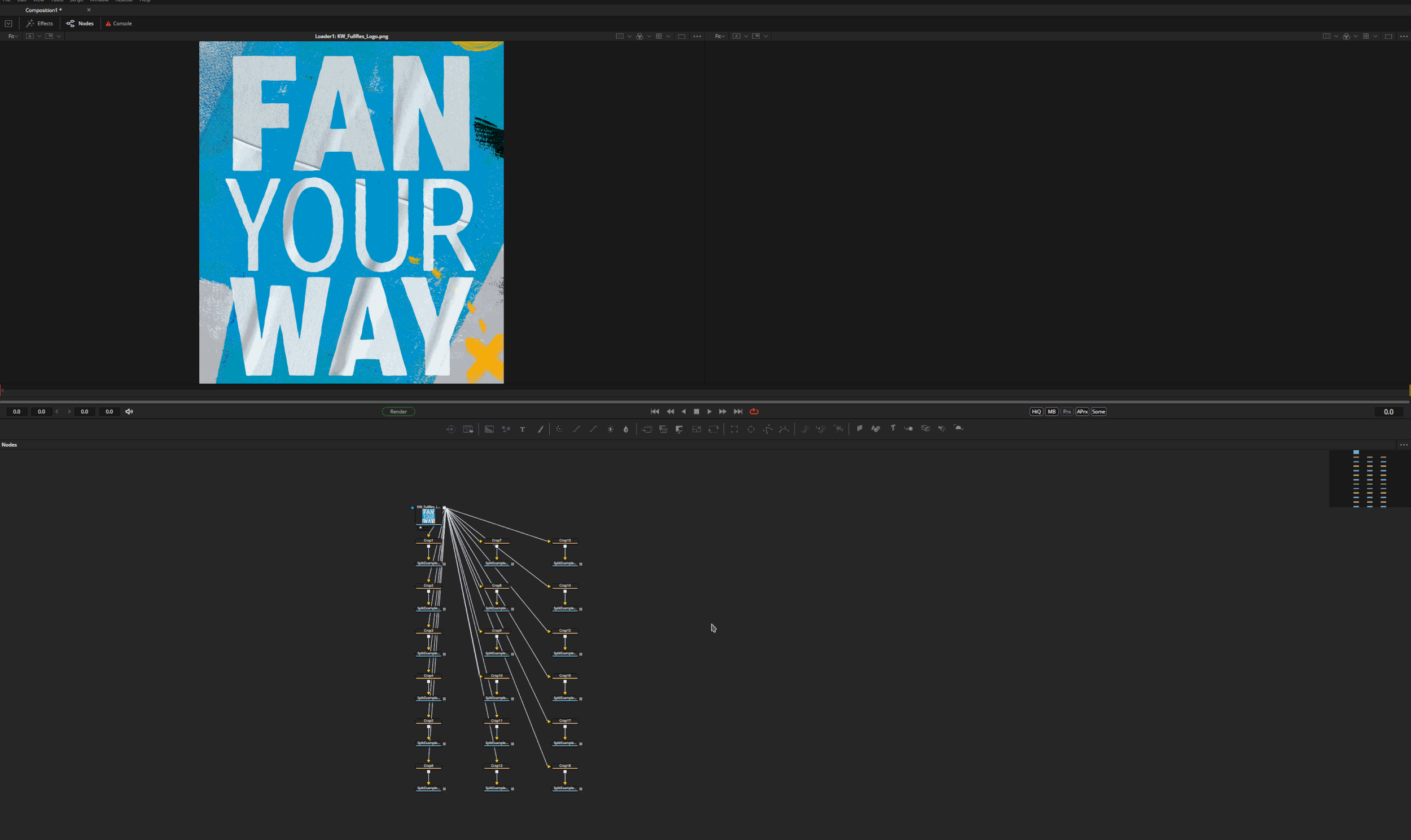 With Blackmagic Fusion’s memory efficiency and multi-threading, as well as it’s ability to render multiple outputs at once it was an ideal tool to automate the final spit and render process in. This tool is a fast and efficient way to set up fusion comps to render all necessary outputs at once. Simply enter the destination folder, name prefix, desired file format, and sub-screen resolution and this tool will fill out the fusion comp with everything needed to hit “render“ immediately. The naming convention used adds a suffix with an identifier for the screen index; 0_0 being the top left screen, 0_1 being leftmost column, second row, 1_0 being second column, first row, etc. This tool gains efficiency as the screens scale as the source file only needs to be loaded once for all the outputs, as opposed to alternate solutions such as NLEs or After Effects that only render one output at once and load the source file for each and every output task. The script also has support for resizing the input sequence in case the animation was built at non-native resolution, as well as a check for screen rotation in the instance that the final display screens are mounted in portrait orientation but still require landscape oriented renders.